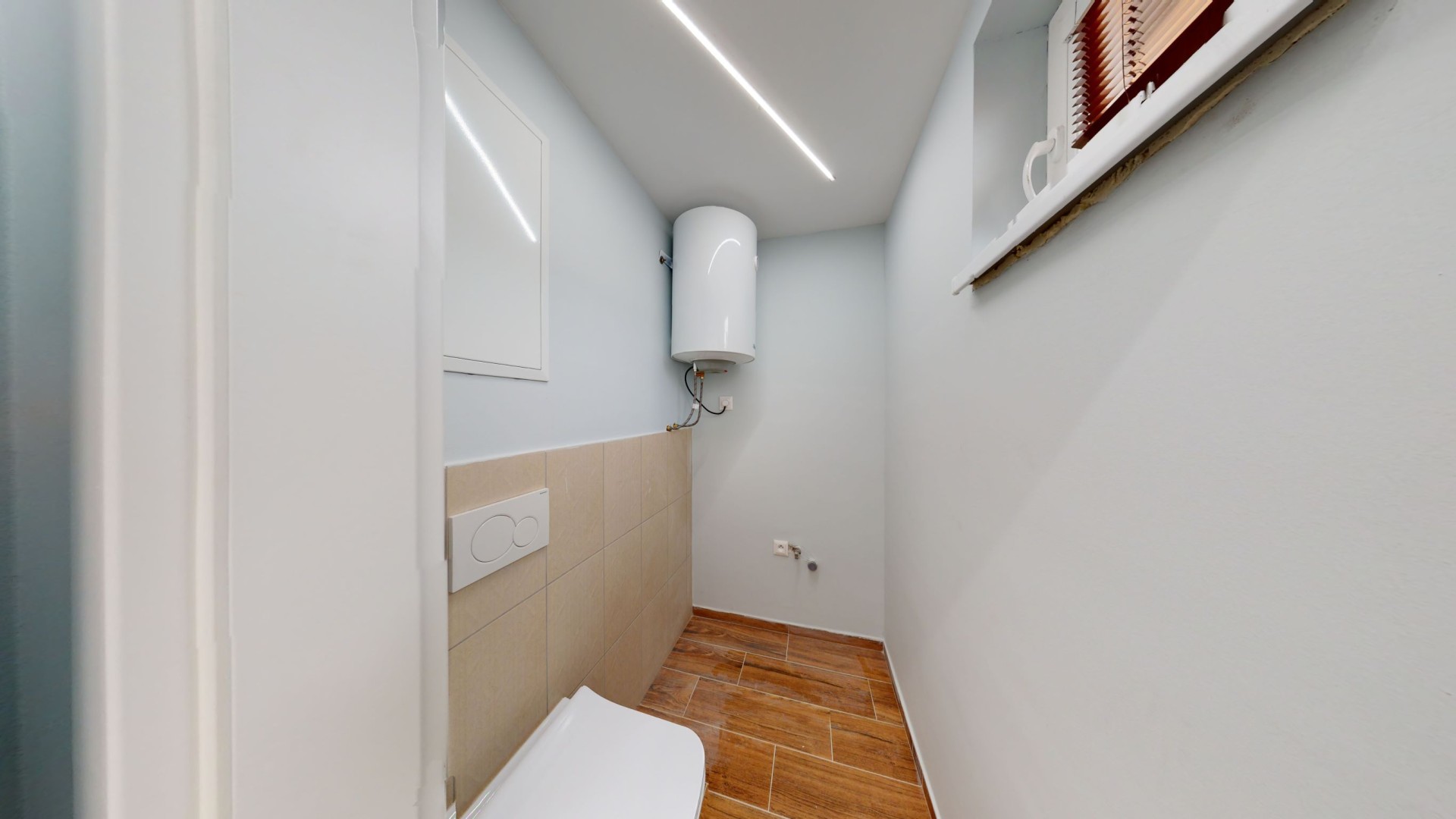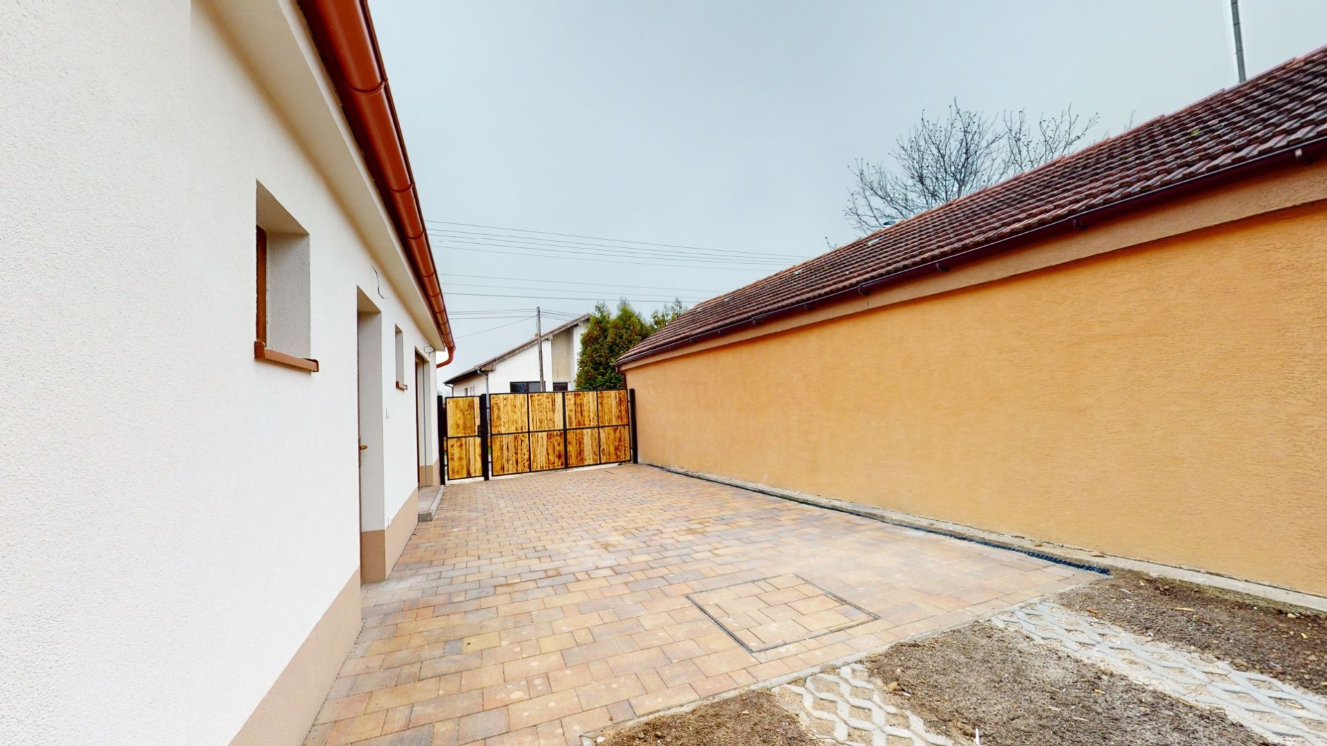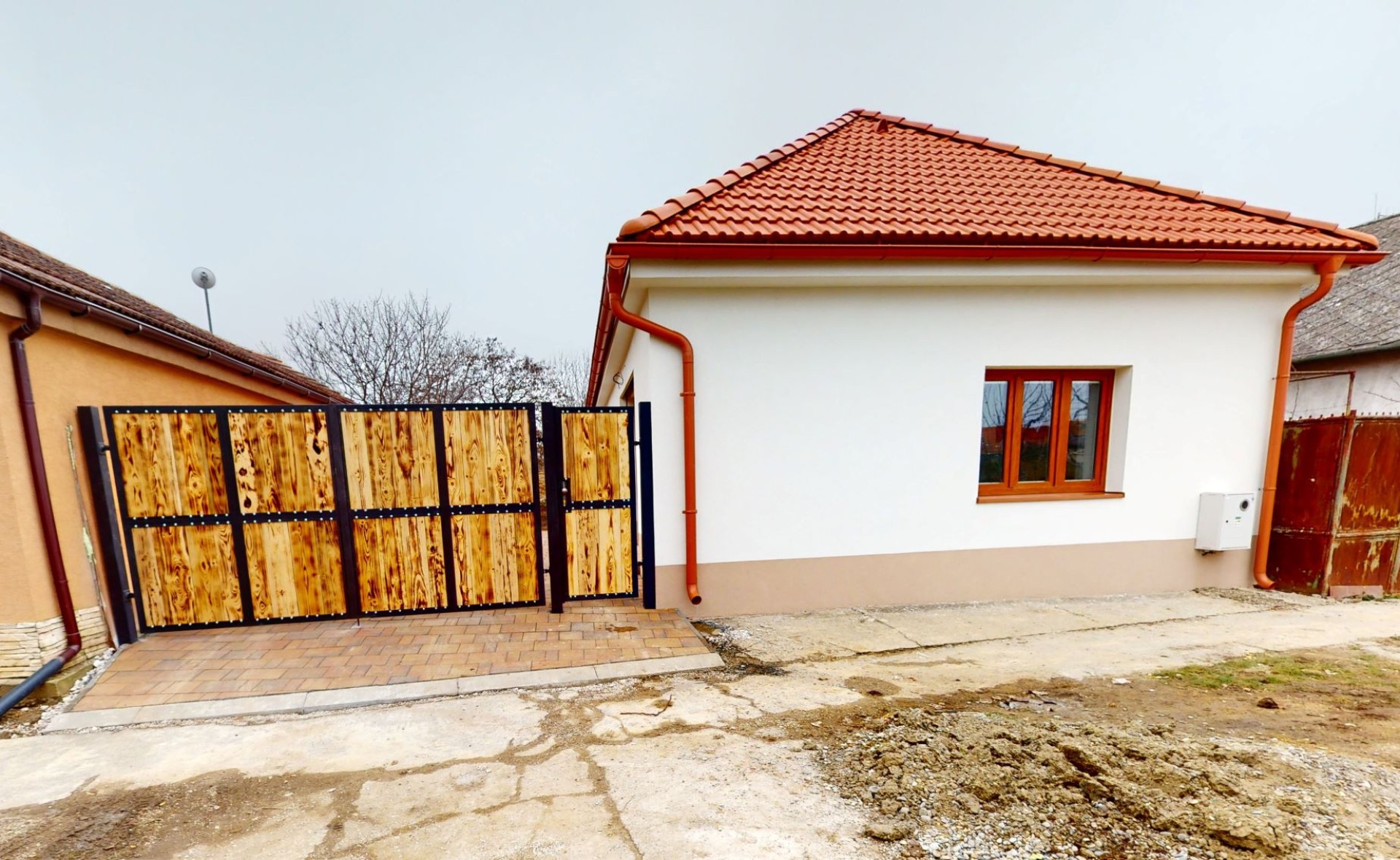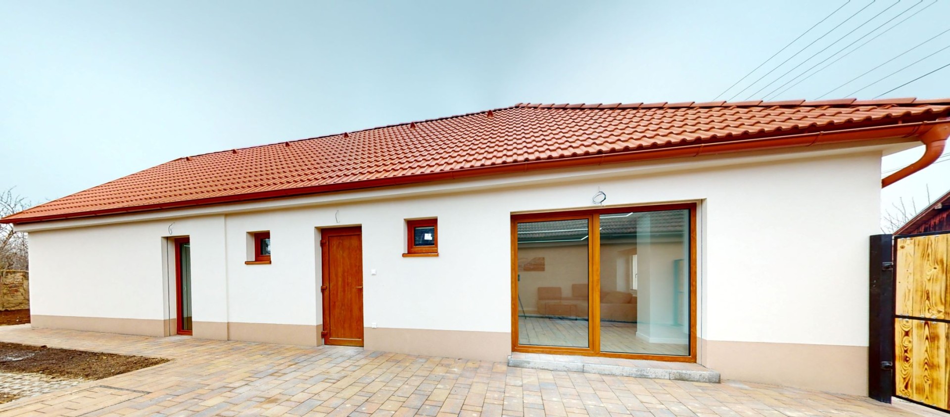 Rodinný dom s celkovou úžitkovou plochou 80m2 dispozične pozostáva zo vstupnej chodby, z ktorej na pravo sa presunieme do technickej miestnosti spolu s toaletou. V technickej miestnosti sa nachádza elektrický bojler so zásobníkom 120l vody. Na ľavo sa dostávame do kúpeľne spolu s toaletou v ktorej boli použité kvalitné obklady, batérie a doplnky vysokej kvality v dizajnovej čiernej farby. Z chodby plynule prejdeme do priestrannej kuchyne. V kuchyni na ľavo sú vstupy do dvoch samostatných izieb. Z každej izby je vstup na dvor. Z kuchyne sa ďalej presunieme do slnečnej obývačky spolu s jedálenským kútom. V celom dome pri rekonštrukcii boli vymenené elektrické rozvody s novou prípojkou zo stĺpu, voda, podlahové kúrenie v každej izbe sa nachádza termostat na reguláciu tepla, nové omietky, maľovka, sadrokartónové stropy. V každej miestnosti je osvetlenie riešené LED svetlami, ktoré sú zapracované v sadrokartónovom strope - regulovaná kvalitná svietivosť. V celom dome boli použité kvalitné vodeodolné laminátové podlahy, lišty.Na oknách sú nainštalované vonkajšie rolety pre najvyšší komfort.