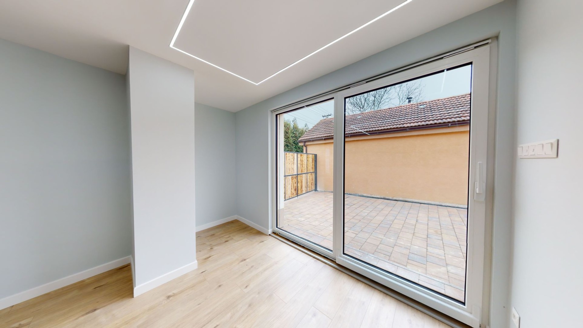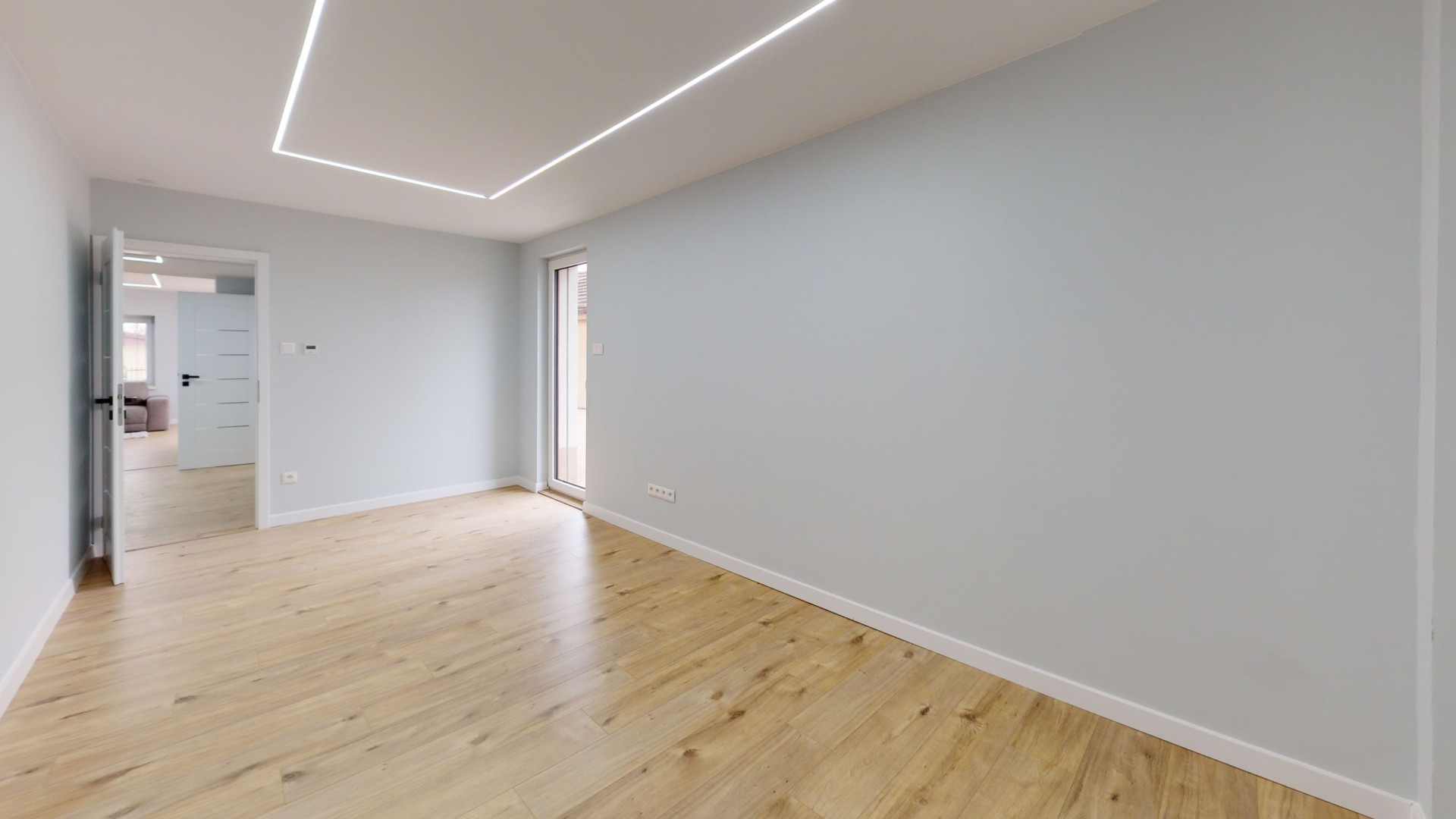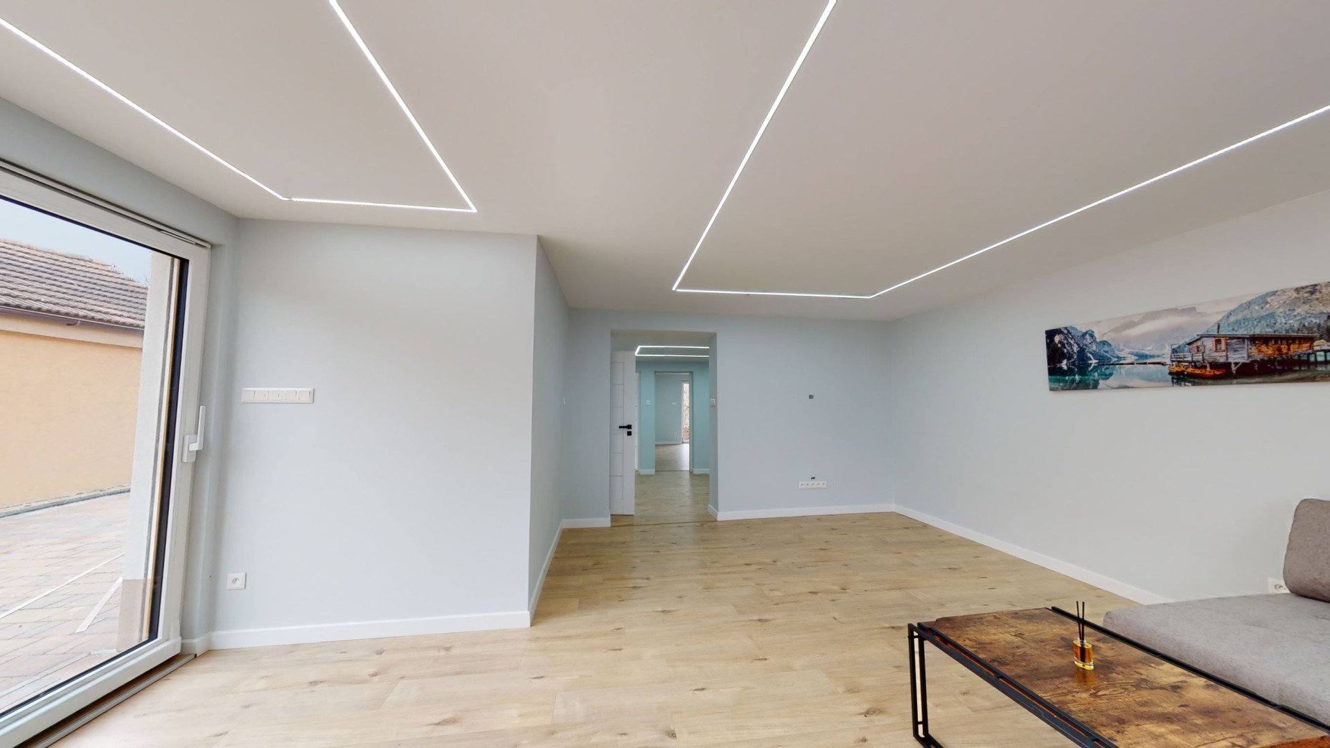 Rodinný dom s celkovou úžitkovou plochou 80m2 dispozične pozostáva zo vstupnej chodby, z ktorej na pravo sa presunieme do technickej miestnosti spolu s toaletou. V technickej miestnosti sa nachádza elektrický bojler so zásobníkom 120l vody. Na ľavo sa dostávame do kúpeľne spolu s toaletou v ktorej boli použité kvalitné obklady, batérie a doplnky vysokej kvality v dizajnovej čiernej farby. Z chodby plynule prejdeme do priestrannej kuchyne. V kuchyni na ľavo sú vstupy do dvoch samostatných izieb. Z každej izby je vstup na dvor. Z kuchyne sa ďalej presunieme do slnečnej obývačky spolu s jedálenským kútom. V celom dome pri rekonštrukcii boli vymenené elektrické rozvody s novou prípojkou zo stĺpu, voda, podlahové kúrenie v každej izbe sa nachádza termostat na reguláciu tepla, nové omietky, maľovka, sadrokartónové stropy. V každej miestnosti je osvetlenie riešené LED svetlami, ktoré sú zapracované v sadrokartónovom strope - regulovaná kvalitná svietivosť. V celom dome boli použité kvalitné vodeodolné laminátové podlahy, lišty.Na oknách sú nainštalované vonkajšie rolety pre najvyšší komfort.