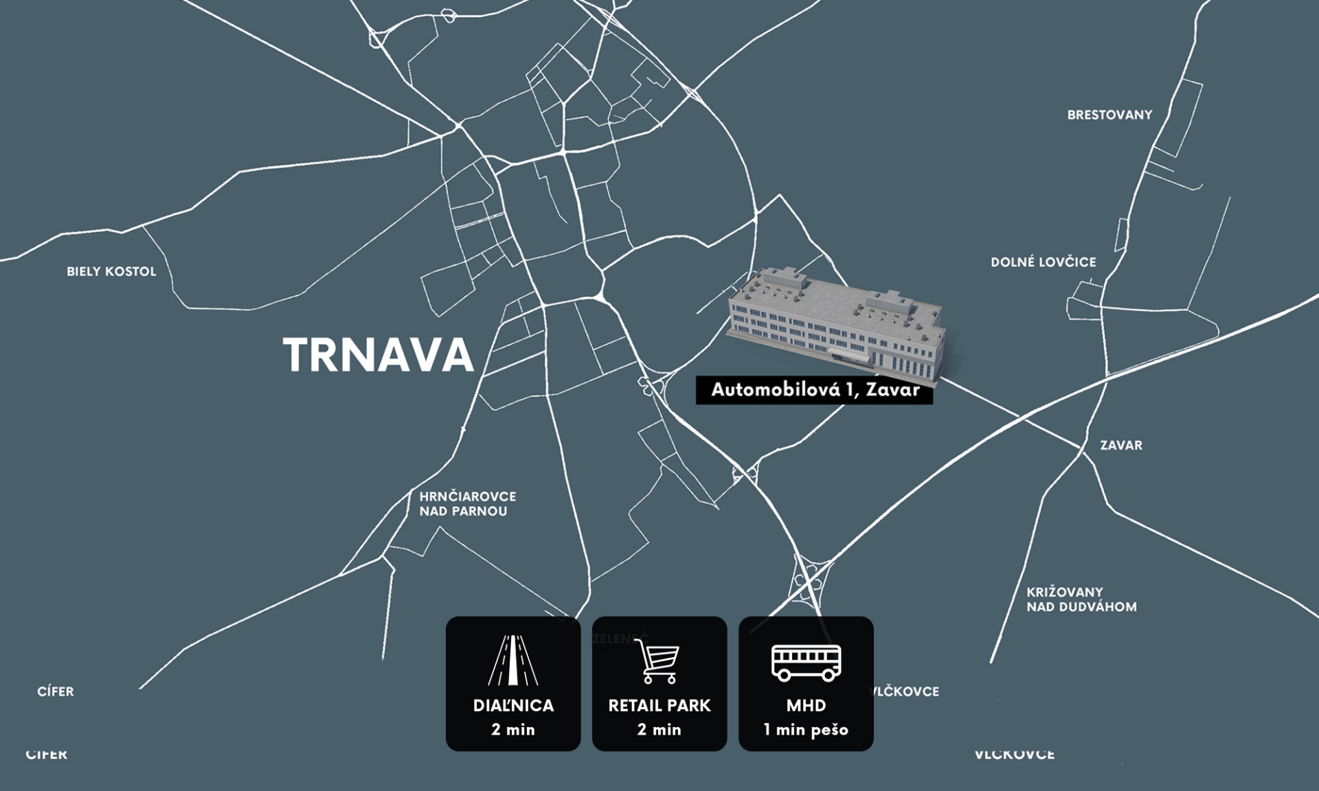 V lokalite sa nachádza množstvo firiem, je výborne napojená na R1, D1 a obchvat Trnavy, v blízkosti sa nachádza zástavka mhd, retailové centrum.