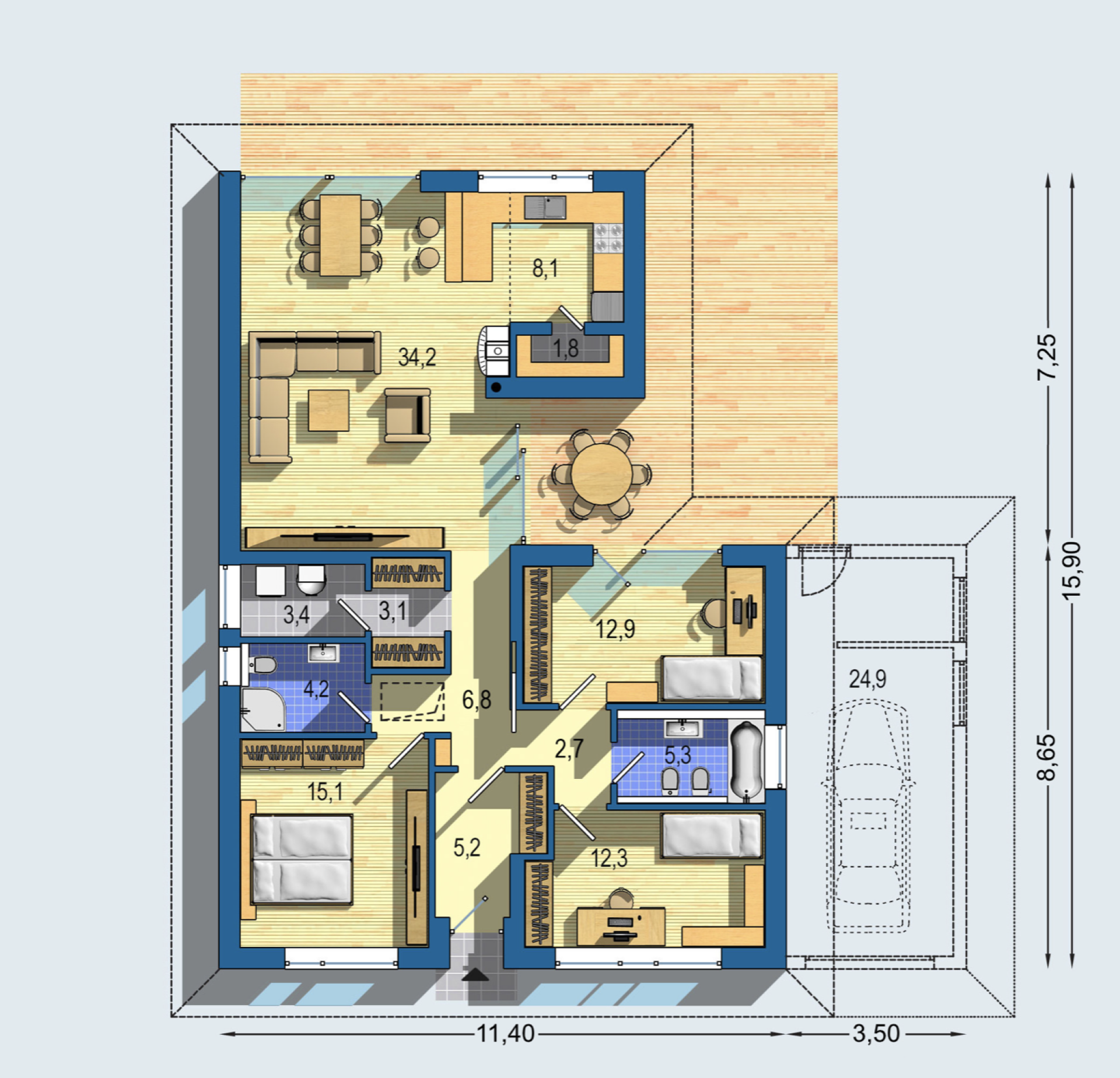 Samotný návrh domu vychádza z overeného dispozičného riešenia domu. Nočná a denná časť sú ideálne rozložené, od prvej chvíli sa v ňom budete cítiť príjemne. Krásny a vzdušný interiér, ktorý vám umožňuje rodinné zdieľanie aktivít, ale aj intimitu a súkromie. V dome sa nachádzajú 3 samostatné spálne, kúpeľňa, 2 toalety, technická miestnosť, dostatok úložných priestorov a vzdušná, priestranná obývacia izba s kuchyňou a špajzou. Osadenie domu reflektuje daný pozemok s maximalizáciou súkromia a výhľadov na Smolenický zámok. Vedľa domu je možnosť dobudovať prístrešok pre auto.