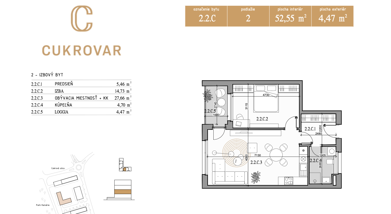 Byt sa nachádza na 2. podlaží a má výmeru 52,55 m² + loggia 4,47 m².