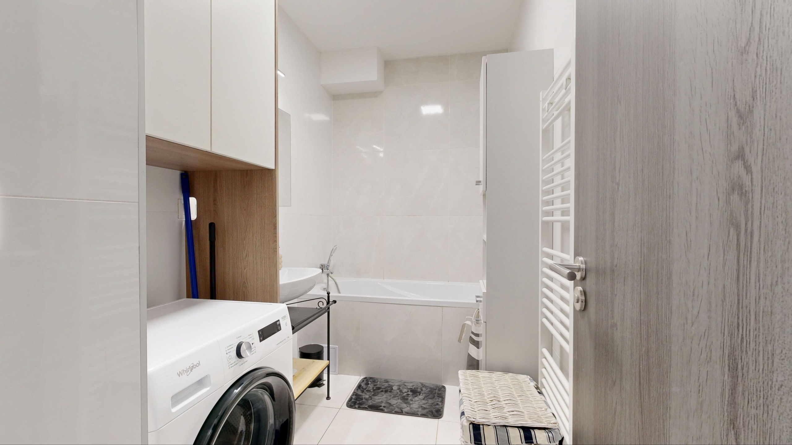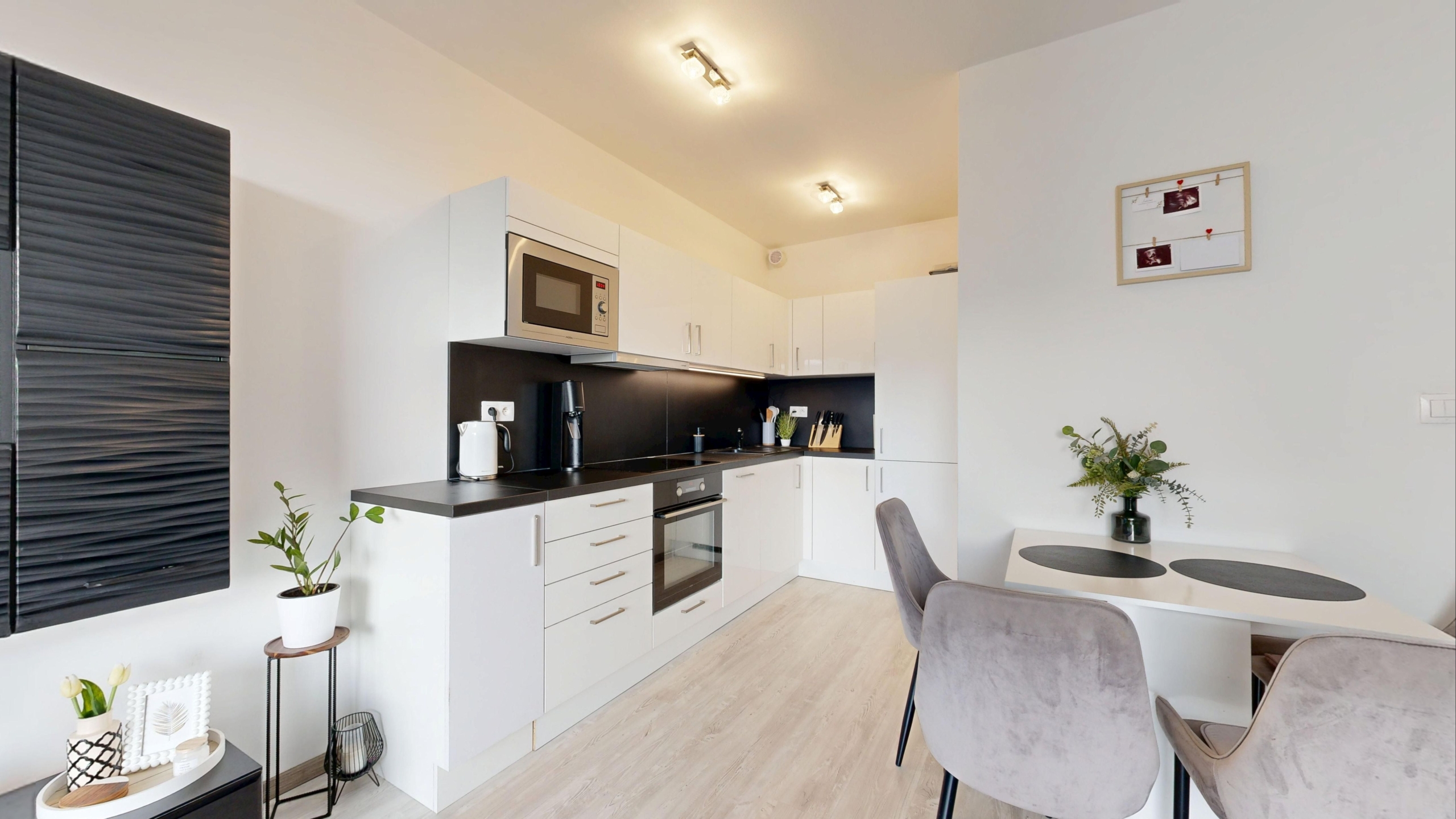 Kuchyňa je vybavená kuchynskou linkou so vstavanými spotrebičmi, vrátane umývačky riadu. Obývacia izba ponúka pohodlnú sedačku, konferenčný stolík, televíznu skrinku a televízor. Nájdete tu tiež jedálenský stôl so stoličkami. Spálňa disponuje manželskou posteľou, priestrannou šatníkovou skriňou a francúzskym balkónom. V kúpeľni sa nachádza vaňa a práčka, toaleta je samostatná.