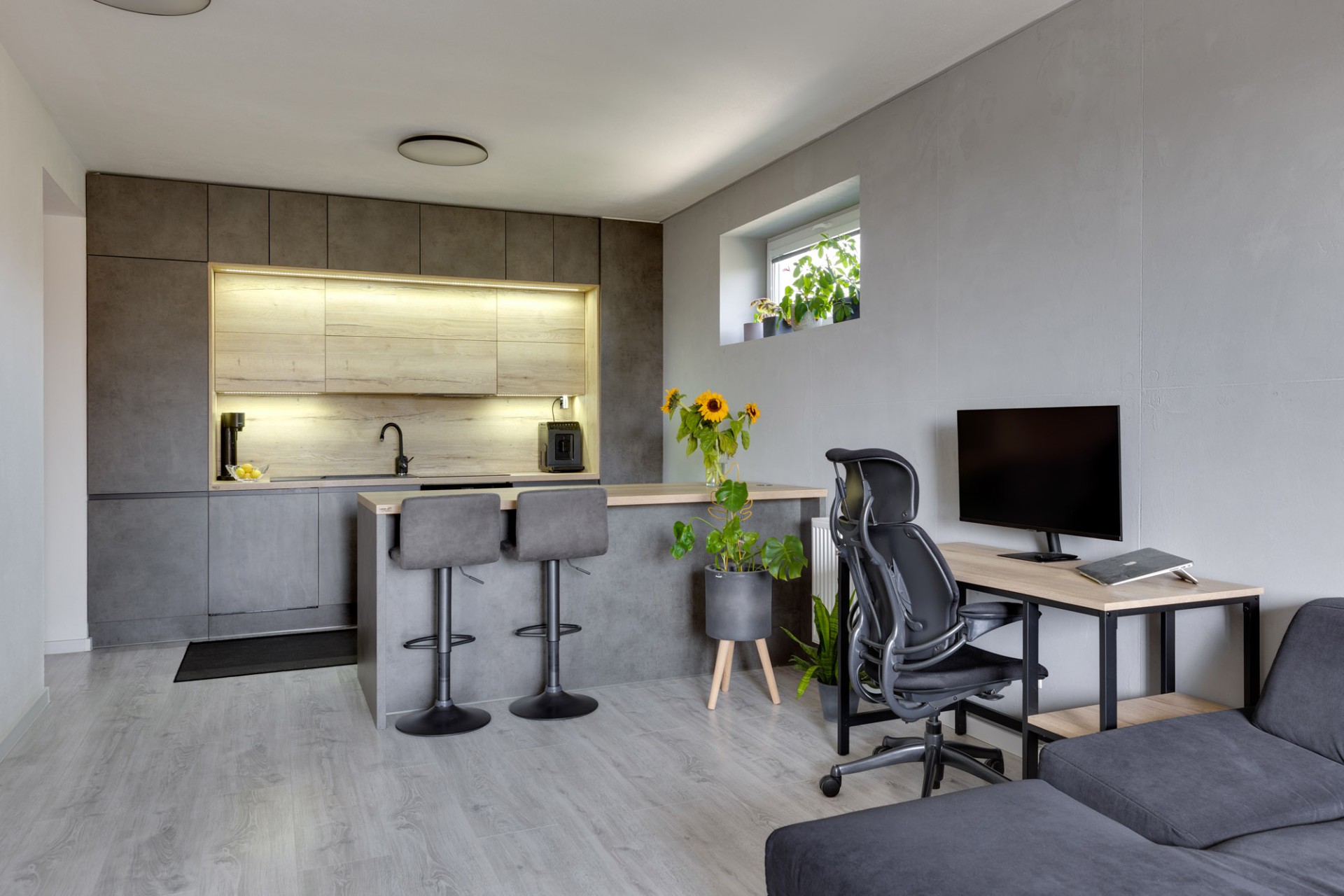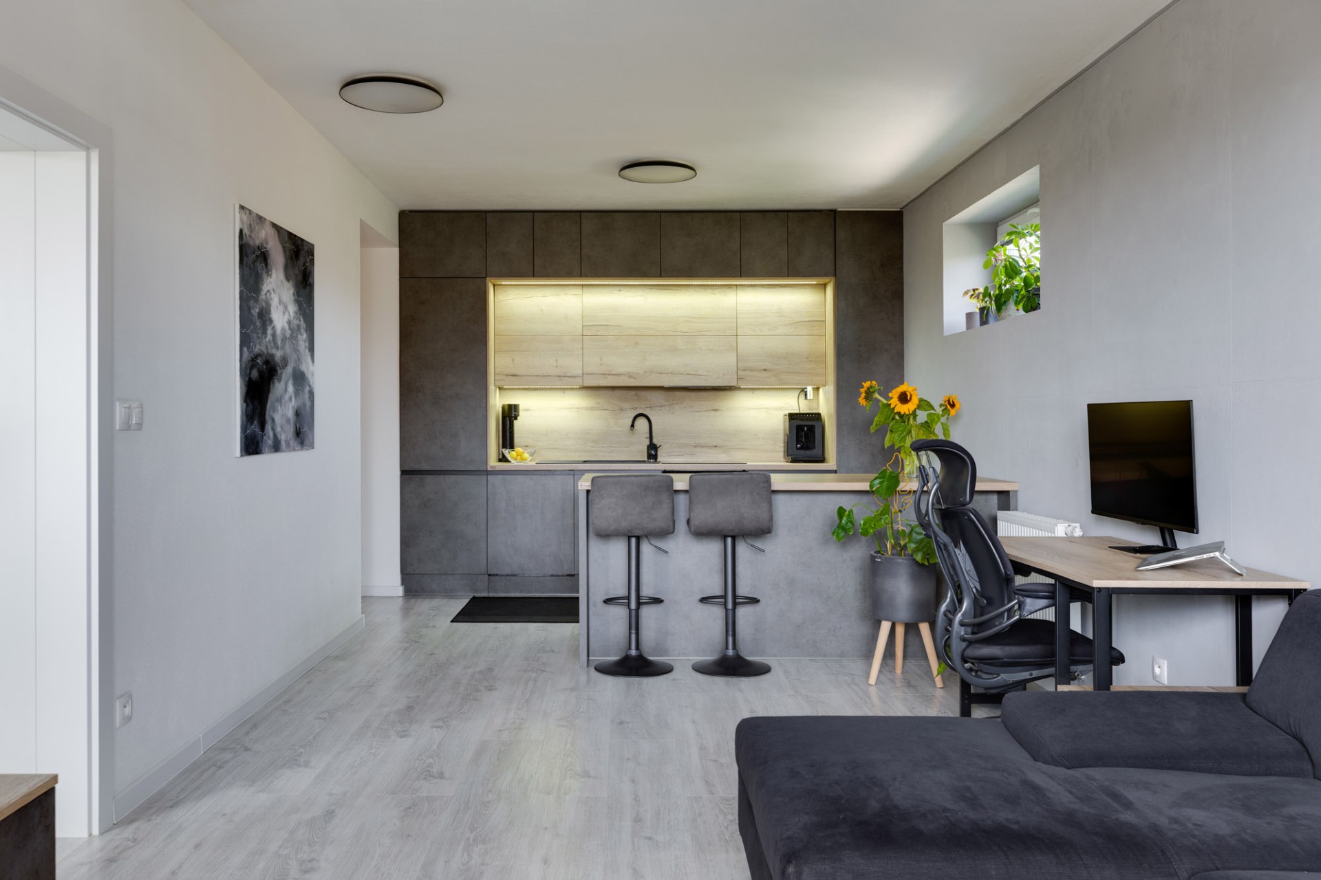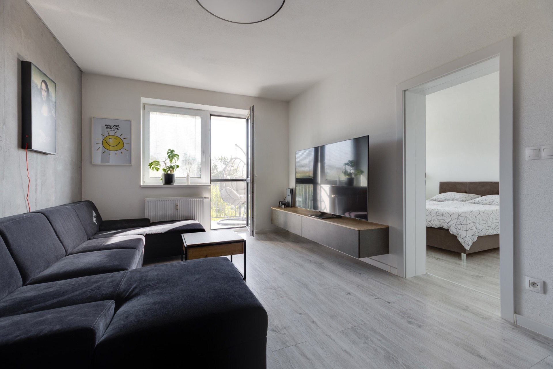Byt má úžitkovú plochu 54,39 m², k tomu balkón o výmere 4,68 m² a sklad priamo na poschodí 1,2 m². Dominantou bytu je veľkorysá denná časť – obývacia izba s kuchyňou o rozlohe až 30 m², aká sa v dvoch izbových bytoch len zriedka vyskytuje. Celý interiér je ladený v nadčasovom štýle s použitím kvalitných materiálov. Kuchynská linka, vstavané skrine aj TV zostava boli vyrobené stolárom na mieru, pričom použité boli vstavané spotrebiče značky Bosch.
