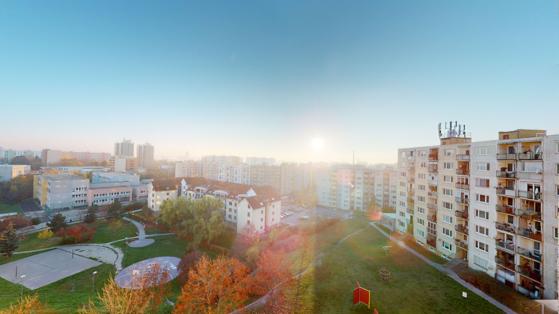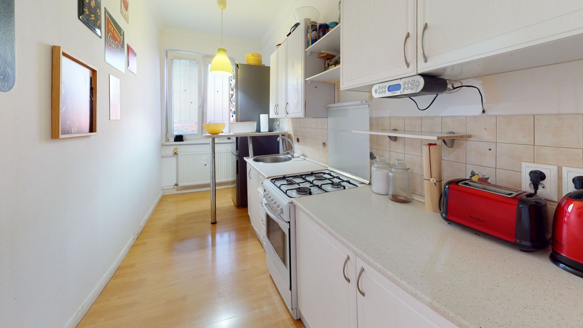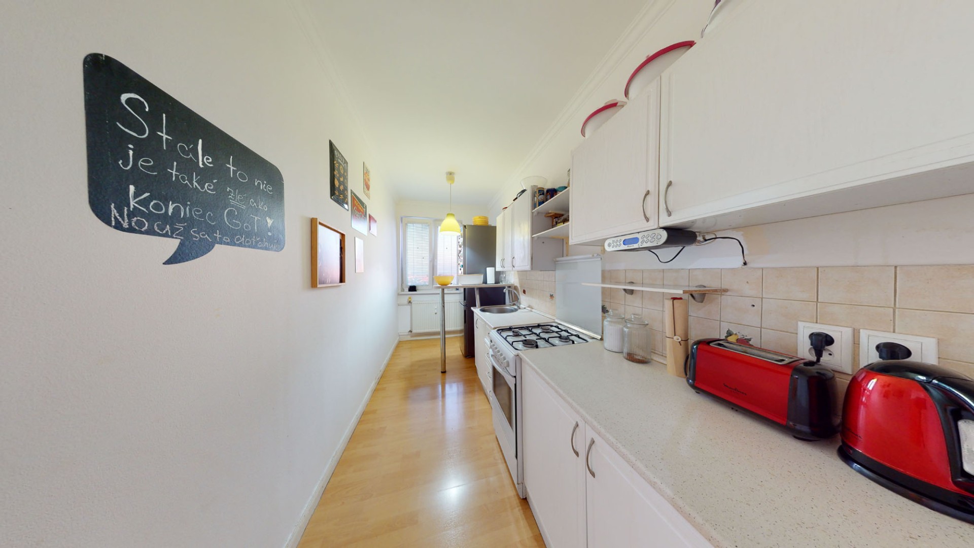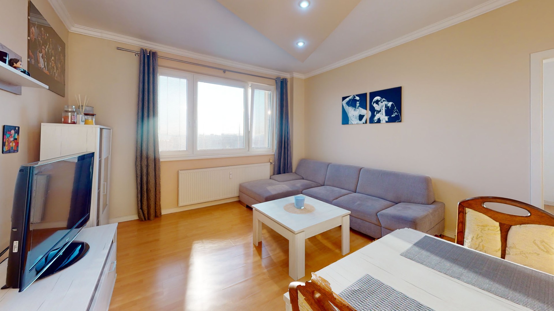 Dispozične byt pozostáva z hlavnej chodby, hneď oproti je kúpeľňa s wc. V kúpeľni je vaňa a predpríprava na sprchový kút. Na jednej strane chodby sa nachádza priestranná obývacia izba s jedálenským kútom a vedľa je spálňa. Zo spálne je vstup na loggiu s pekným výhľadom na veľkú časť Trnavy vďaka vyššiemu podlažiu, na ktorom sa byt nachádza. V ďalšej časti bytu na druhej strane chodby je ďalšia izba a hneď vedľa je kuchyňa. Byt sa predáva zariadený. Bytový dom prešiel kompletnou rekonštrukciou, v rámci ktorej bol aj zateplený.